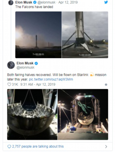 北京时间2019年4月12日6点35分,美国民营航天公司SpaceX的猎鹰重型火箭(Falcon Heavy)时隔一年再次从肯尼迪航天中心 LC-39A 发射台发射。